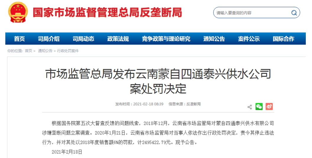 根據(jù)國(guó)務(wù)院第五次大督查反饋的問(wèn)題線索,2018年12月,云南省市場(chǎng)監(jiān)管局對(duì)蒙自四通泰興供水有限公司涉嫌壟斷問(wèn)題立案調(diào)查。2020年1月21日,云南省市場(chǎng)監(jiān)管局對(duì)當(dāng)事人依法作出行政處罰決定,責(zé)令其停止違法行為,并對(duì)其處以2018年度銷售額6%的罰款,計(jì)2495422.79元。