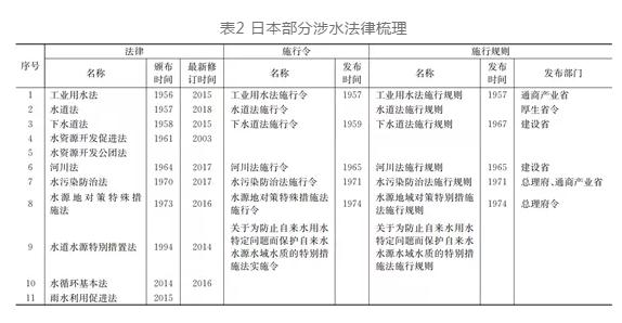 日本的法律體系可以分為憲法、法律、政令、省令和通達(dá)5個(gè)層次。通過國會(huì)頒布法律、內(nèi)閣頒布政令以及省頒布省令,對(duì)涉水工作進(jìn)行全面的規(guī)定(見表2)。例如國會(huì)頒布《河川法》,內(nèi)閣負(fù)責(zé)發(fā)布《河川法施行令》,主管河道的國土交通省負(fù)責(zé)發(fā)布《河川法施行規(guī)則》。整個(gè)法律體系層次清晰、責(zé)任明確、詳略互補(bǔ),全方位指導(dǎo)涉水工作的開展。日本城市水系統(tǒng)相關(guān)法律較為豐富,核心的涉水法律有《河川法》《水資源開發(fā)促進(jìn)法》《水道法》《下水道法》《水污染防治法》等10余部,覆蓋了河流水系、水資源、供水、用水、排水、水環(huán)境和健康水循環(huán)理念等水系統(tǒng)多角度、全要素的內(nèi)容。日本涉水法律內(nèi)容詳盡,明確涉水工作的責(zé)任主體、職能分工、協(xié)調(diào)機(jī)制,部分法律還對(duì)技術(shù)標(biāo)準(zhǔn)進(jìn)行詳細(xì)規(guī)定,例如《水道法》將水質(zhì)基準(zhǔn)的內(nèi)容納入法律框架體系,強(qiáng)化了標(biāo)準(zhǔn)執(zhí)行力度。日本涉水法律體系修訂更新周期短,如有必要最短1年時(shí)間即可開展法律修訂,例如《下水道法》在2005年、2011年和2015年分別針對(duì)城市內(nèi)澇、事權(quán)改革、雨水公共下水道建設(shè)問題開展修訂,極大的保障了法律的適應(yīng)性。