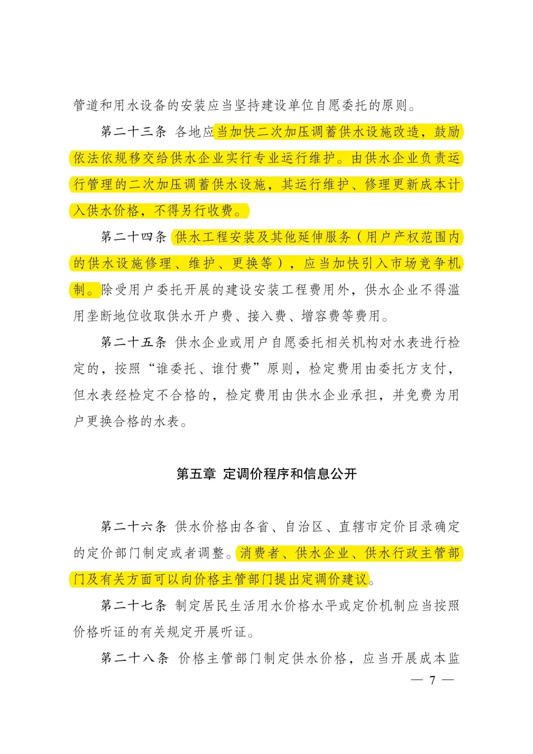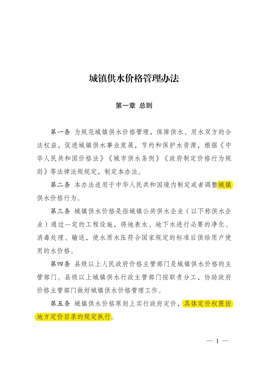 答:《城鎮(zhèn)供水價格管理辦法》明確了城鎮(zhèn)供水價格的定價原則、定價方法、定調(diào)價程序,以及水價分類、計價方式、規(guī)范供水企業(yè)服務(wù)收費行為等。主要內(nèi)容:一是按照“準許成本加合理收益”的方法核定城鎮(zhèn)供水價格。制定城鎮(zhèn)供水價格,以成本監(jiān)審為基礎(chǔ),通過核定準許成本、監(jiān)管準許收益確定準許收入,根據(jù)核定供水量確定供水價格,并統(tǒng)籌考慮當?shù)毓┧聵I(yè)發(fā)展需要、促進節(jié)約用水、社會承受能力、服務(wù)質(zhì)量等因素。二是簡化水價分類、明確計價方式。城鎮(zhèn)供水根據(jù)使用性質(zhì)分為居民生活用水、非居民用水、特種用水三類,居民生活用水實行階梯水價制度、非居民用水實行超定額累進加價制度。三是規(guī)范定調(diào)價程序、強化信息公開。要求制定居民生活用水價格水平或定價機制應(yīng)當按照價格聽證的有關(guān)規(guī)定開展聽證,并進行信息公開。四是規(guī)范服務(wù)收費行為、提升服務(wù)質(zhì)量。明確供水水質(zhì)、水壓應(yīng)當符合國家規(guī)定標準。除受用戶委托開展的建設(shè)安裝工程費用外,供水企業(yè)不得濫用壟斷地位收取供水開戶費、接入費、增容費等費用。
