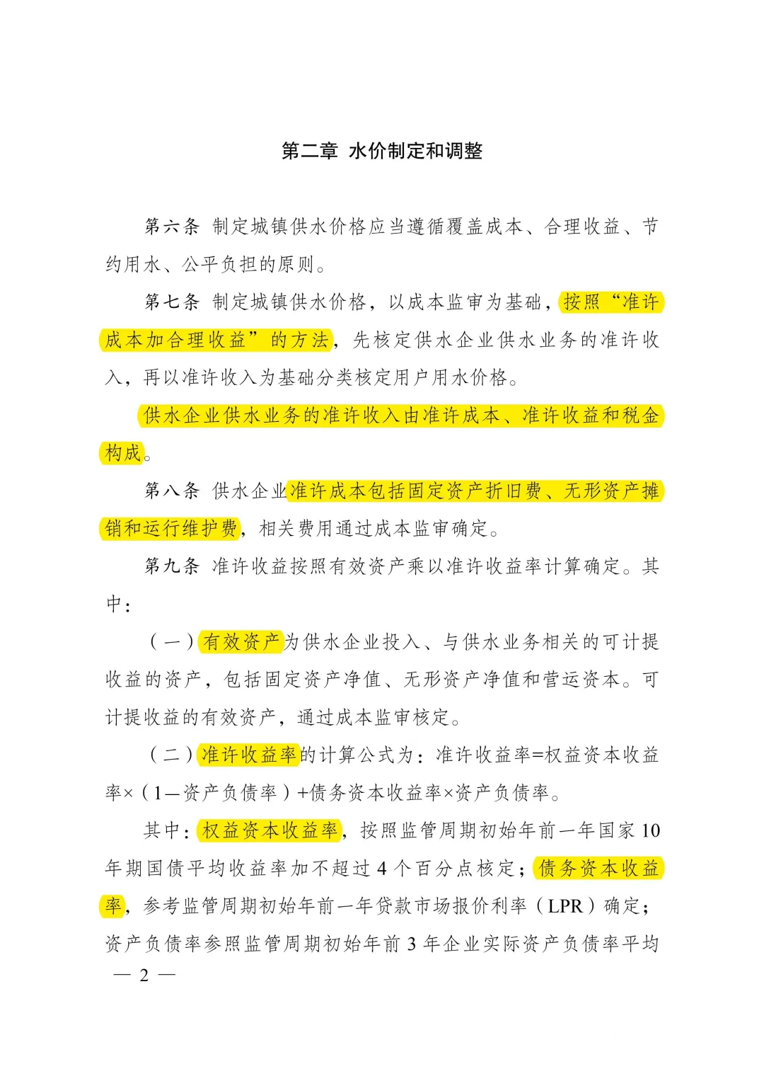 三是建立了參考市場利率合理確定供水收益率的機制。明確供水企業(yè)準許收益率根據(jù)權(quán)益資本收益率、債務(wù)資本收益率確定,權(quán)益資本收益率按照10年期國債收益率加不超過4個百分點核定,債務(wù)資本收益率按照貸款市場報價利率確定,有利于吸引社會資本進入,促進供水行業(yè)健康持續(xù)發(fā)展。