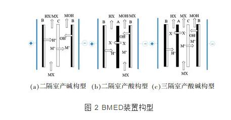 bpm與aem、cem組成的bmed的裝置構(gòu)型從簡單的二隔室發(fā)展為三隔室,由b-c-b或者b-a-b組合成的二隔室和由b-a-c-b構(gòu)成的三隔室bmed。見圖 2。
