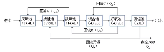 小試裝置為變形uct工藝,由有機(jī)玻璃材質(zhì)制成,長×寬×高為1.44 m×0.3 m×0.3 m,有效容積為120 l,通過擋板分為5個(gè)反應(yīng)區(qū)。小試裝置反應(yīng)區(qū)構(gòu)成及其體積如圖1所示。每個(gè)反應(yīng)池設(shè)有攪拌器,在混合池及好氧池底部各均勻布置6個(gè)曝氣頭。好氧池末端連接23 l柱狀沉淀池,設(shè)計(jì)表面負(fù)荷為0.64 m3/(m2·h)。為避免藻類滋生對試驗(yàn)產(chǎn)生影響,整個(gè)反應(yīng)器池體用黑色遮光布進(jìn)行遮光處理。