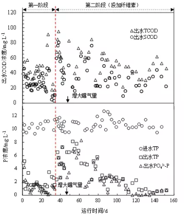 2.1 纖維素對cod與p去除的影響圖2顯示了小試裝置在整個(gè)試驗(yàn)期間出水cod與磷濃度變化。在第一階段進(jìn)水tcod濃度維持在450 mg/l時(shí),出水tcod平均為(39.7±16.1)mg/l,其中scod為(24.8±10.8) mg/l,符合國家一級a排放標(biāo)準(zhǔn)。然而,當(dāng)?shù)诙A段加入纖維素后,cod去除效果明顯惡化,出水tcod最高檢測值高達(dá)95 mg/l(scod為80 mg/l)。為探究加入纖維素后cod去除效果惡化原因,對出水tcod的構(gòu)成進(jìn)行了分析。結(jié)果顯示,加入纖維素后出水ss顯著下降,從(48.25±3.29) mg/l降至(21.34±9.71) mg/l,由此可排除污泥沉降性能惡化導(dǎo)致出水cod升高問題。纖維素富含官能團(tuán)且呈線狀,因此其對污泥具有較好網(wǎng)捕卷掃作用,可促進(jìn)污泥絮體凝結(jié)并提高其緊密度,這一現(xiàn)象通過污泥鏡檢也得到了印證。然而,不論是因纖維素自身作為cod消耗氧氣,還是導(dǎo)致污泥絮體變得緊密都有可能降低氧傳質(zhì),從而弱化了對cod的降解效率。為此,在第46 天對好氧池運(yùn)行進(jìn)行調(diào)整,將曝氣量提高至0.30~0.50 l/min(添加纖維素前為0.10~0.20 l/min)。結(jié)果,出水cod開始逐漸下降并恢復(fù)至投加纖維素前水平(tcod=49.4 mg/l,scod=34.2 mg/l)??梢?,回收纖維素對曝氣池運(yùn)行有著積極影響,可提高氧氣傳質(zhì)與利用效率。