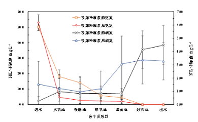 與此同時(shí),纖維素投加對磷去除的影響與cod類似,在纖維素投加初期(第36~50 天),出水總磷(tp)和正磷酸鹽(po3-4-p)濃度均開始惡化,去除率分別降低至51.99%和56.32%。從發(fā)生原因來看,do不足是導(dǎo)致磷去除效率下降的主因,可以從增大曝氣量后出水tp逐漸下降得到驗(yàn)證。然而,出水tp含量在提高曝氣量后的很長一段時(shí)間內(nèi)也沒有恢復(fù)至投加纖維素前水平,而是保持在(2.86±1.22) mg/l左右。為進(jìn)一步分析其原因,在第68 天從曝氣池末端取混合樣進(jìn)行了聚磷菌(paos)活性測定,并與投加纖維素前的活性進(jìn)行了對比。結(jié)果顯示,投加纖維素后,反應(yīng)器中paos比釋磷速率和比吸磷速率分別為11.3 和12.0mg/(gvss?h),與投加前的10.8 、13.4 mg/(gvss?h)相比變化并不是很大??梢姡w維素的投加對paos活性的影響并不大。因此,反應(yīng)器除磷效果恢復(fù)較慢的原因可能與纖維素投加初期導(dǎo)致的跑泥和生物量恢復(fù)較慢有關(guān)。2.2 纖維素對氮去除的影響圖3顯示了在投加纖維素前后裝置對氮去除效果的變化。從整體上看,反應(yīng)器無論是否投加纖維素均能夠很好地完成脫氮,投加前出水tn、nh4+-n和 no3--n平均濃度分別(5.9±3.1)、(0.40±0.96)(4.59±2.22)mg/l,投加后為(7.80±5.46)、(1.30±2.00)、(4.11±2.22) mg/l。只是在纖維素投加初期,出水tn出現(xiàn)明顯惡化,此時(shí)出水中nh4+-n明顯增多,這顯然與上述氧傳質(zhì)受限有關(guān)。圖3顯示,在增大曝氣量后對tn的去除效率迅速恢復(fù),主要是因?yàn)橄趸芰﹂_始恢復(fù)。