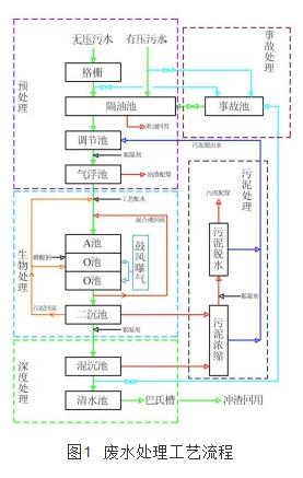 根據(jù)酚氰廢水的水質(zhì)特征,確定采用重力除油+加壓溶氣氣浮+sdn(a/oo+二沉池)+混凝沉淀的核心工藝對(duì)其進(jìn)行處理,工藝流程如圖 1所示。