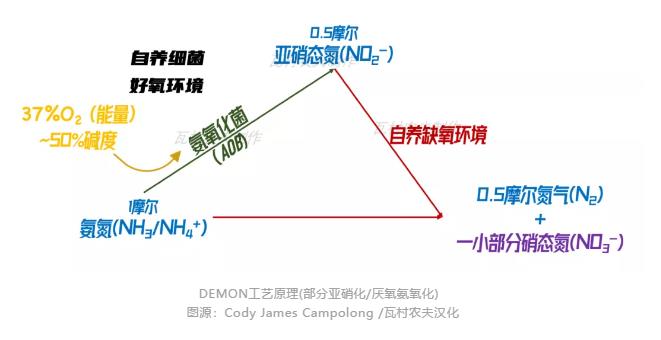 為什么要選擇進(jìn)行部分反硝化的反應(yīng)呢?請(qǐng)大家先再看一眼上邊的圖片:部分亞硝化/厭氧氨氧化(partial nitritation-anammox)除了能將亞硝酸鹽和氨氮轉(zhuǎn)化成氮?dú)庵?,還不可避免地生成硝酸鹽。
