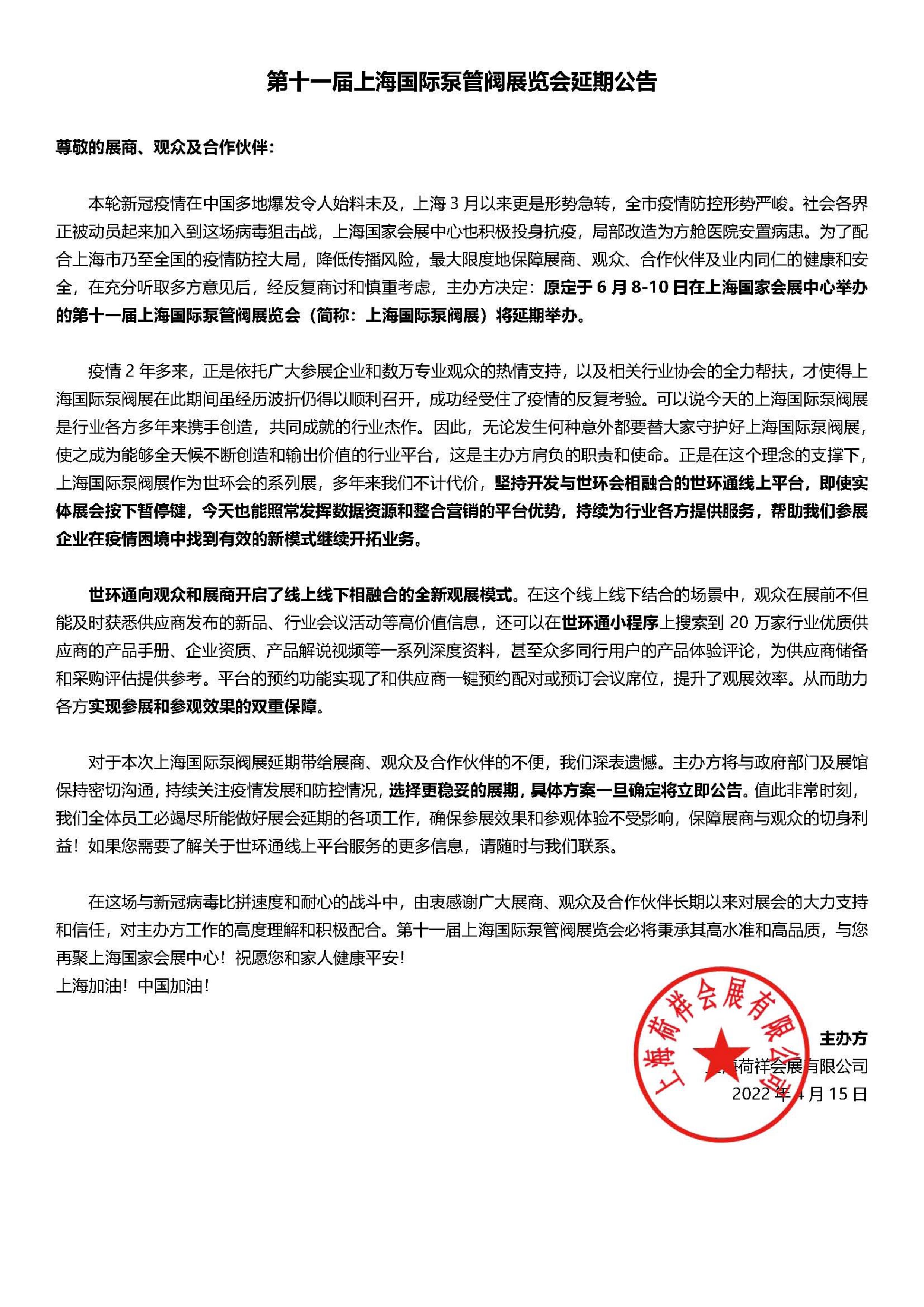 本輪新冠疫情在中國(guó)多地爆發(fā)令人始料未及,上海3月以來更是形勢(shì)急轉(zhuǎn),全市疫情防控形勢(shì)嚴(yán)峻。社會(huì)各界正被動(dòng)員起來加入到這場(chǎng)病毒狙擊戰(zhàn),上海國(guó)家會(huì)展中心也積極投身抗疫,局部改造為方艙醫(yī)院安置病患。為了配合上海市乃至全國(guó)的疫情防控大局,降低傳播風(fēng)險(xiǎn),最大限度地保障展商、觀眾、合作伙伴及業(yè)內(nèi)同仁的健康和安全,在充分聽取多方意見后,經(jīng)反復(fù)商討和慎重考慮,主辦方?jīng)Q定:原定于6月8-10日在上海國(guó)家會(huì)展中心舉辦的第十一屆上海國(guó)際泵管閥展覽會(huì)(簡(jiǎn)稱:上海國(guó)際泵閥展)將延期舉辦。
