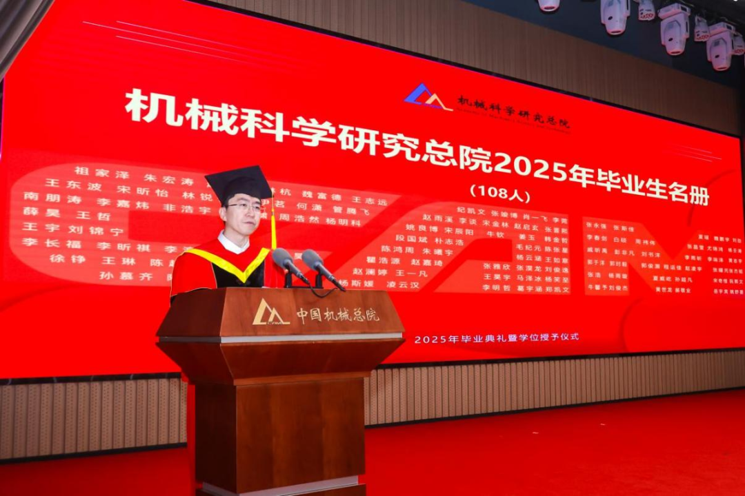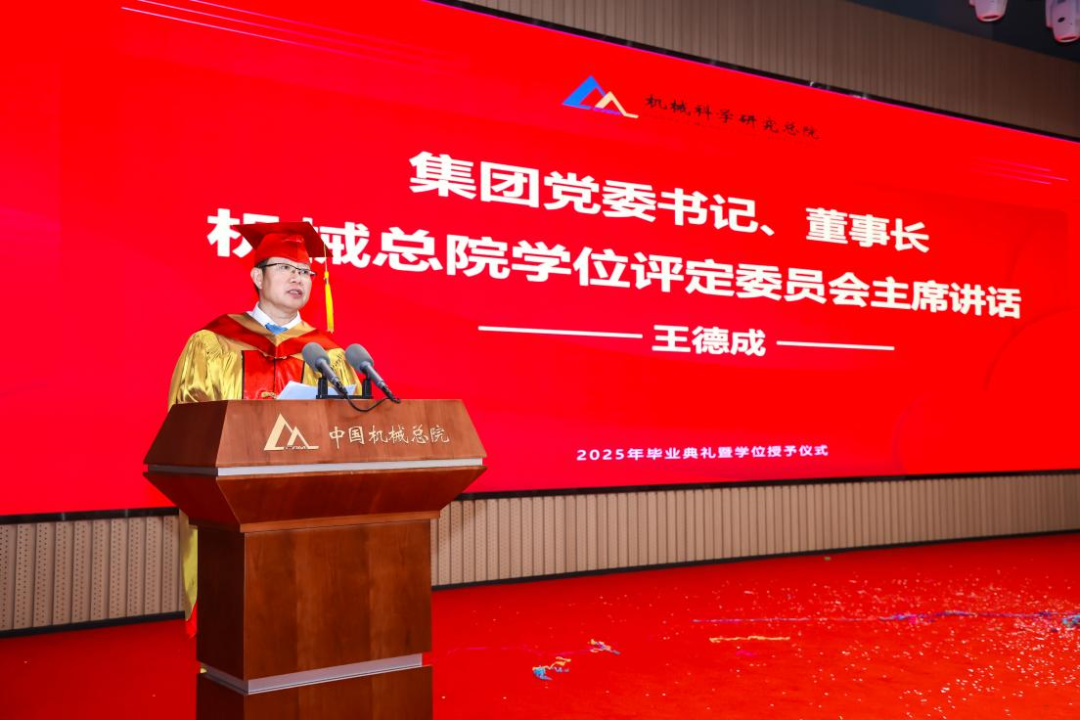 機械總院學位評定委員會主席、集團黨委書記、董事長王德成,集團黨委副書記、總經(jīng)理孟祥宇,集團黨委副書記、董事李玉鑫,集團黨委委員、副總經(jīng)理王宇,機械總院學位評定委員會副主席、集團副總經(jīng)理李愛國,集團副總經(jīng)理姜超出席典禮,機械總院學位評定委員會委員、京內(nèi)外各二級單位領(lǐng)導、導師代表、研究生管理部門負責人、2025屆畢業(yè)生及家屬共計190余人齊聚一堂,共同見證這一重要時刻。典禮由機械總院學位評定委員會秘書長、研究生院副院長邊翊主持。
